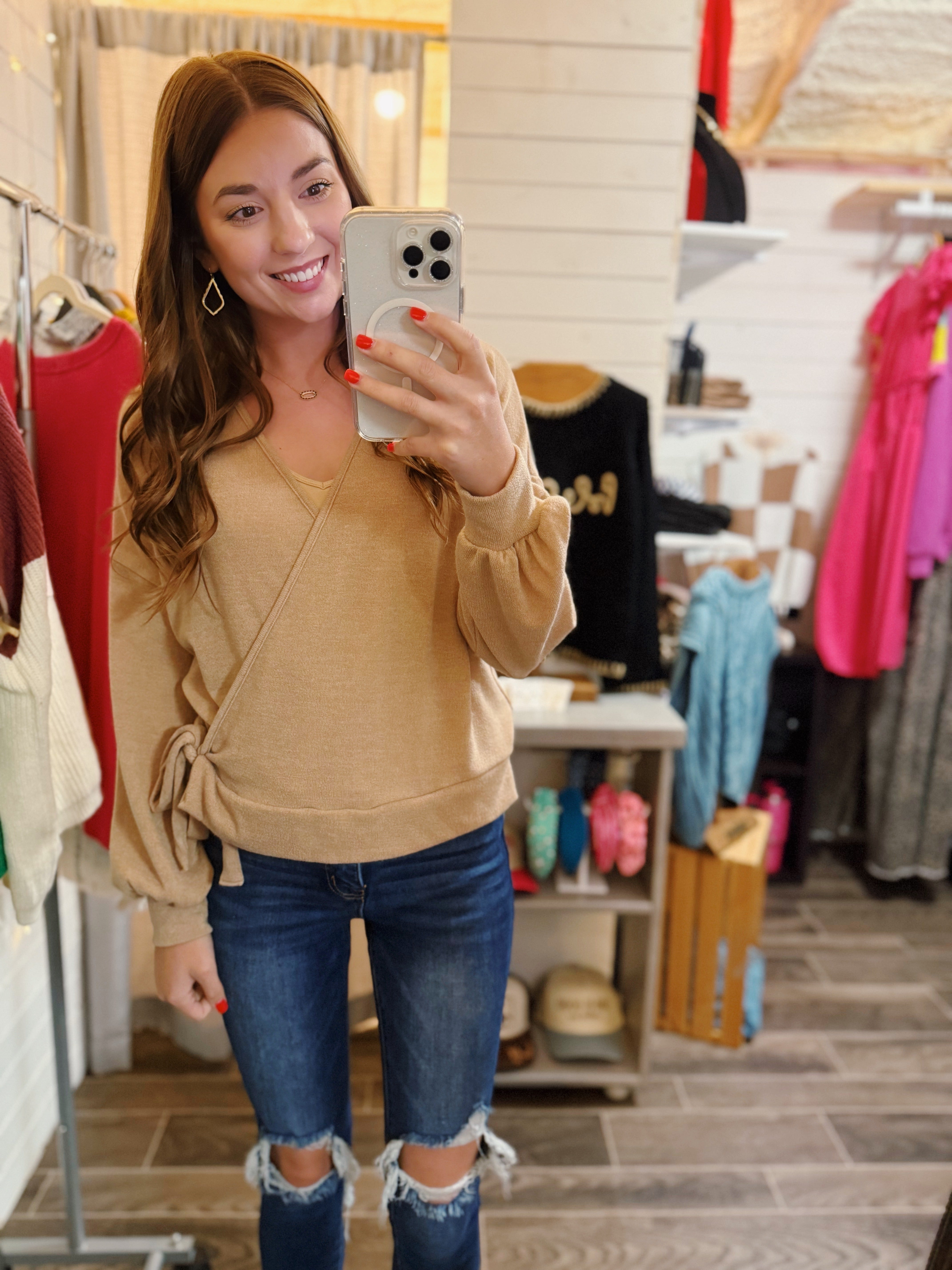 Puff Sleeve Taupe Tie Detail Top