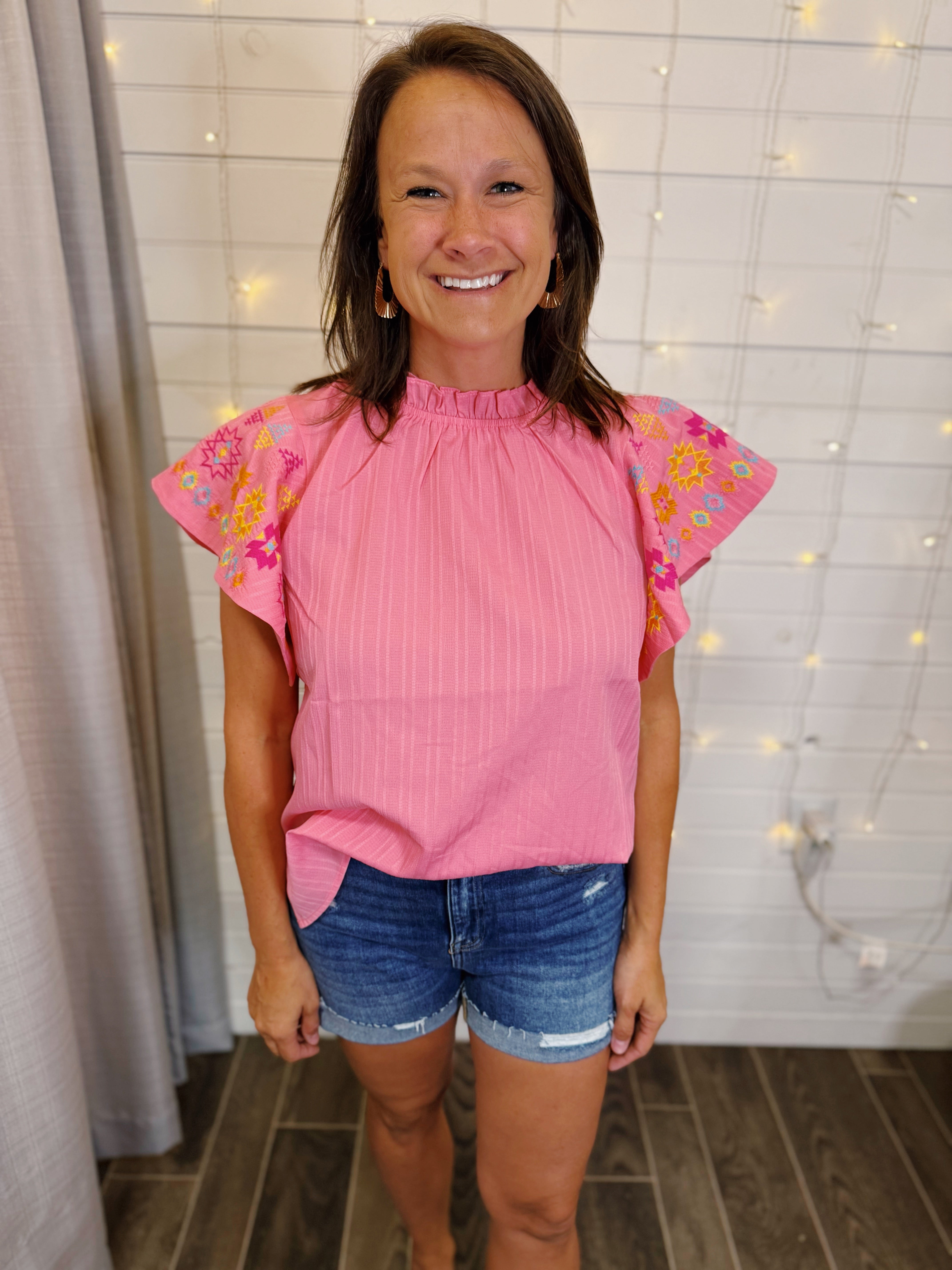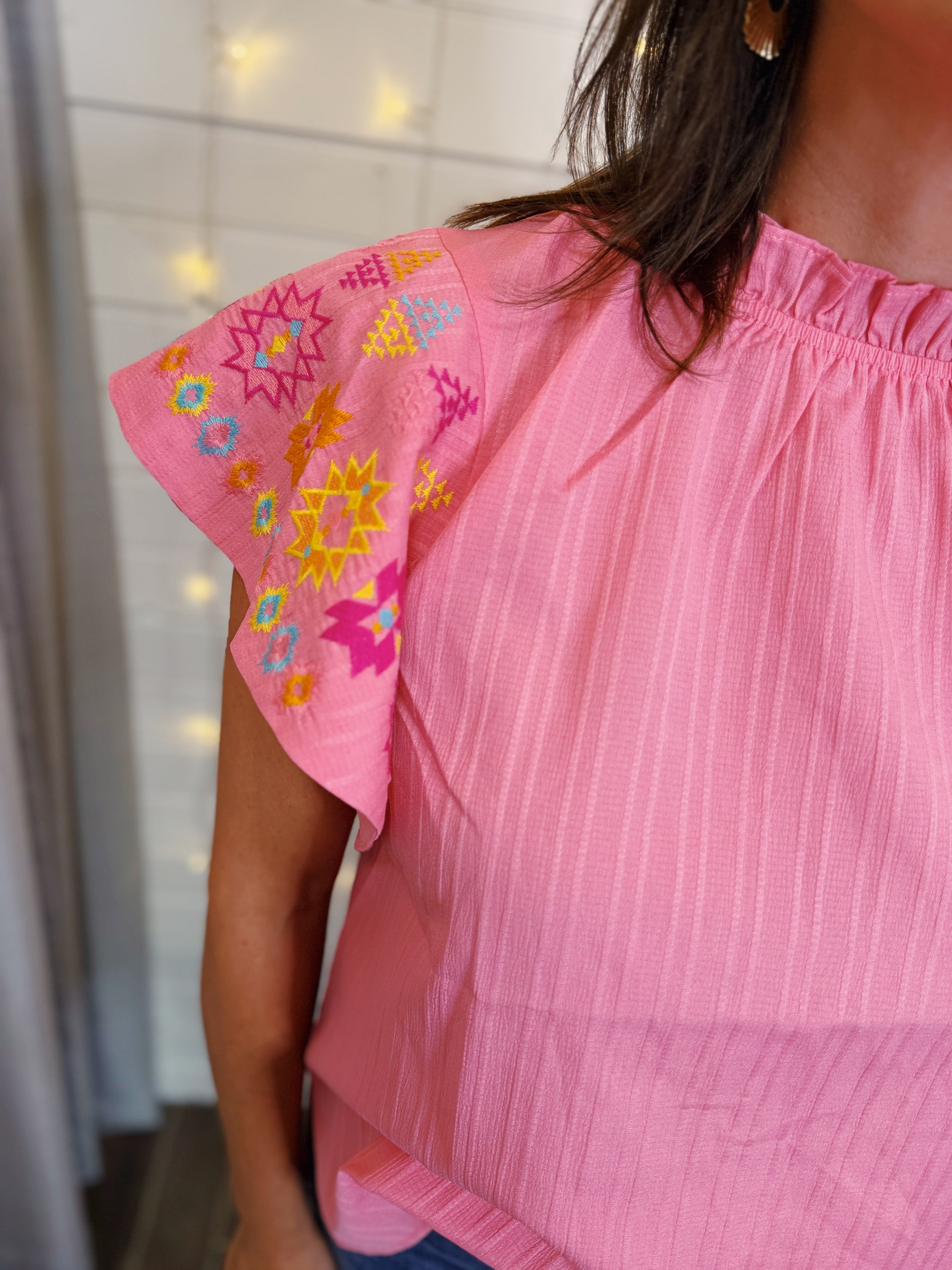 Pink Embroidered Flutter Sleeve Top
